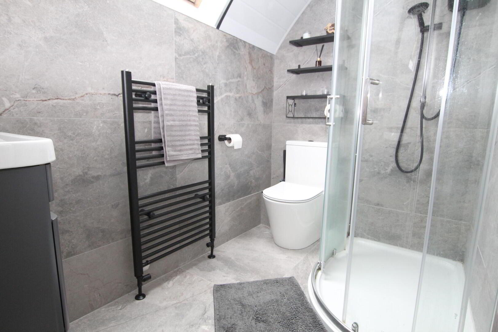 Corner shower enclosure with electric shower and duel shower fitting. WC. Vanity sink unit. Tile effect wall paneling. Tiled floor. PVC tongue and groove ceiling. Chrome towel heater. Velux roof window.