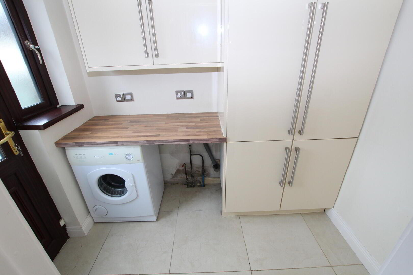 Storage cupboards. Formica work surface. Plumbed for washing machine. Tumble drier space. PVC door to rear.