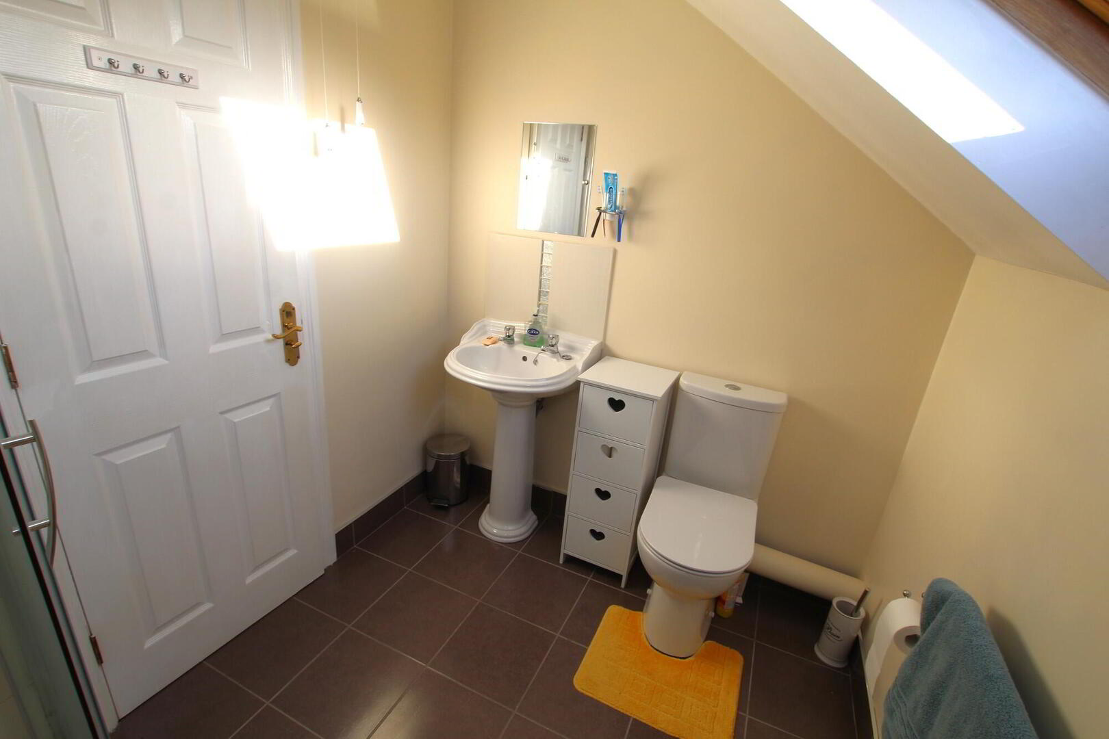 Corner shower cubicle. Pedestal wash hand basin and w.c. Tiled floor. Radiator.