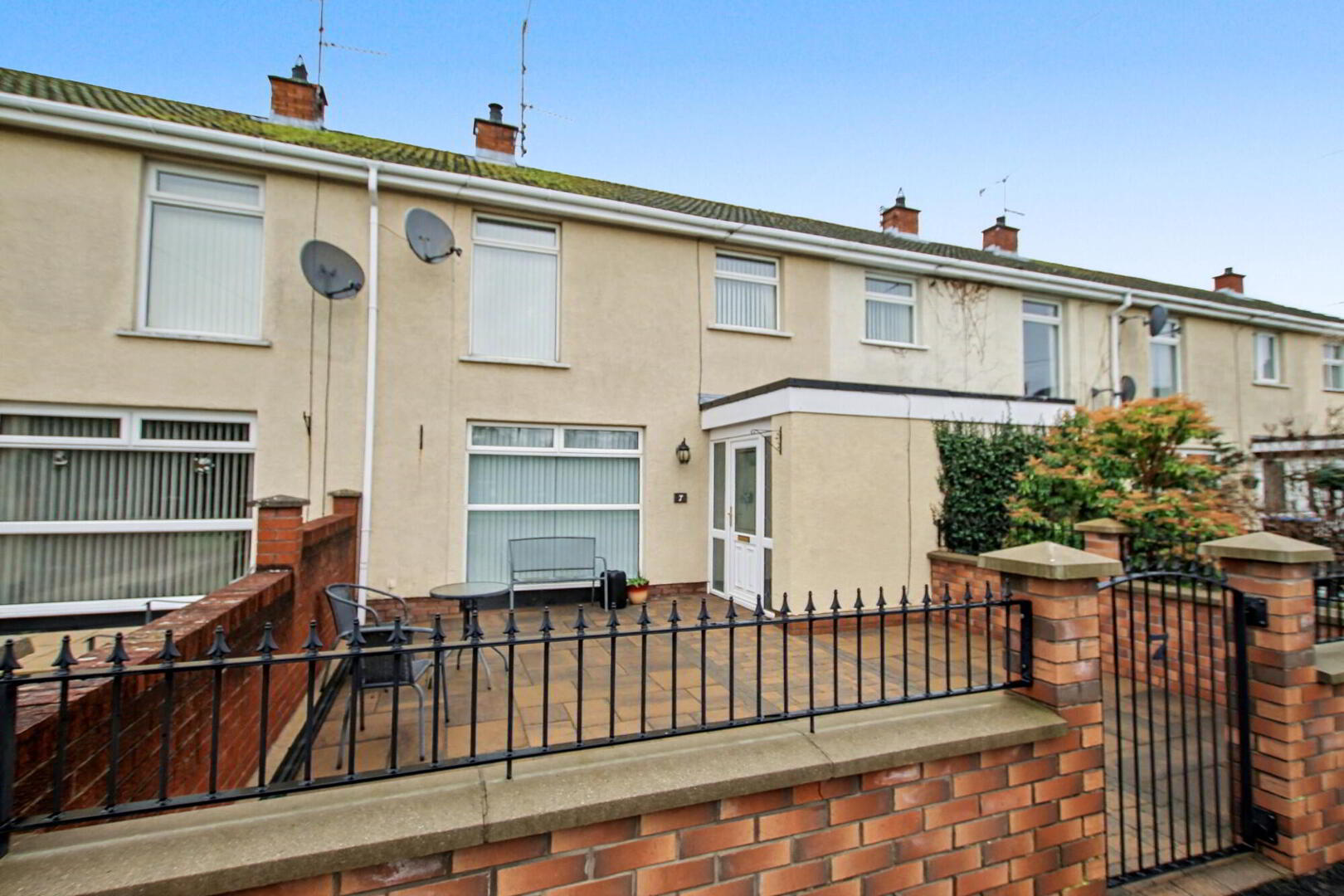 Paved front garden enclosed by brick walls.