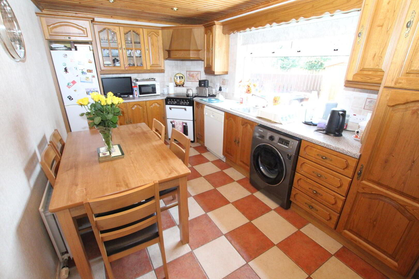 Range of high and low level units – some with glazed displays – includes pelmet with spot lighting. 1½ bowl stainless steel sink unit with mixer taps. Space for fridge freezer. Plumbed for washing machine and dishwasher. Extractor canopy with light and fan. Pine tongue and groove ceiling with bulls eye lighting. Ceramic tiled flooring. Part tiled walls. Radiator.