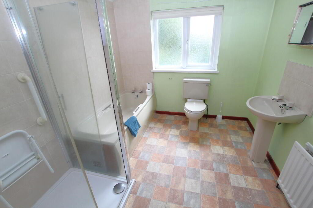 Coloured suite comprising: panel bath. Tiled shower cubicle with electric shower. W.C. Pedestal wash hand basin. Part tiled walls. Radiator.