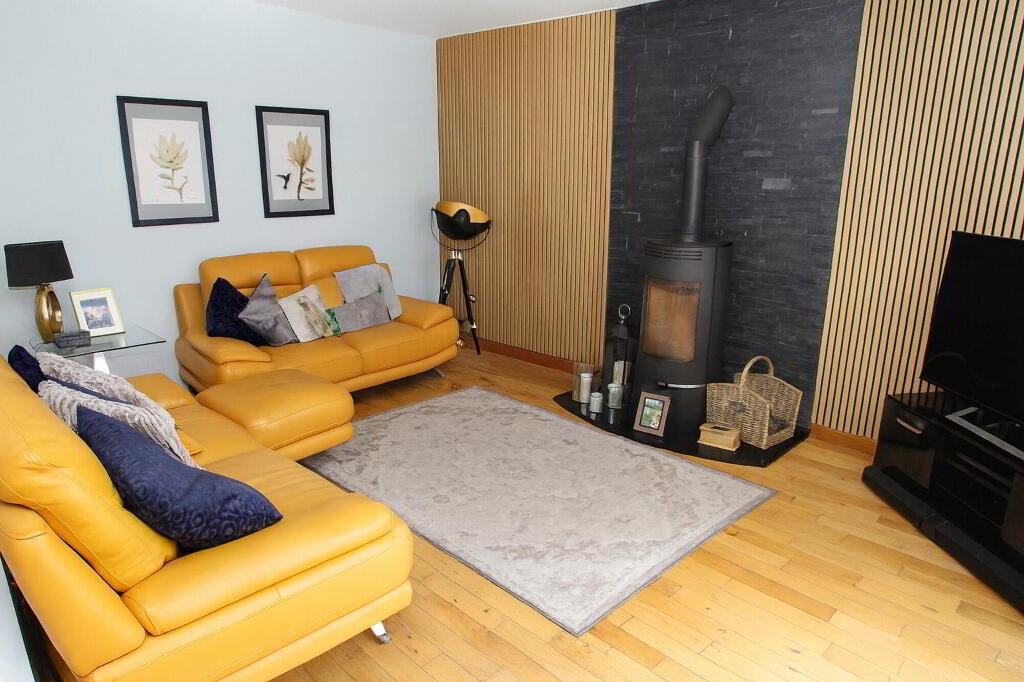 Feature wood burning stove with slate cladding and granite hearth. Part wood panel walls. Wood flooring. Radiator.