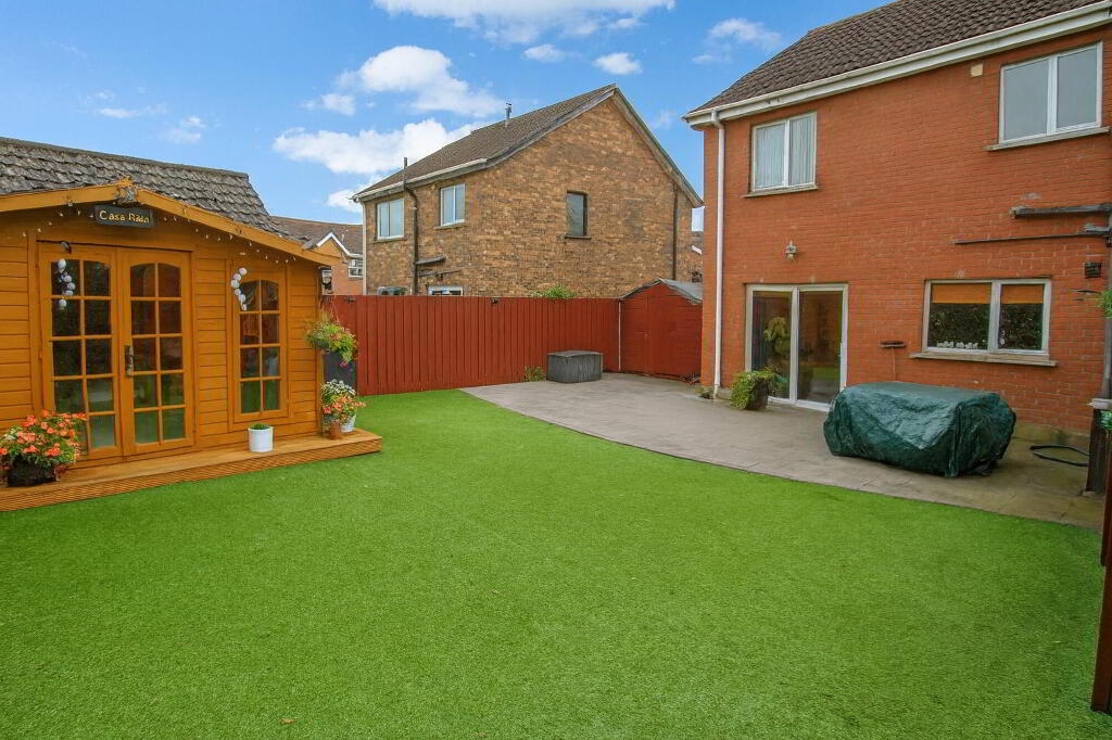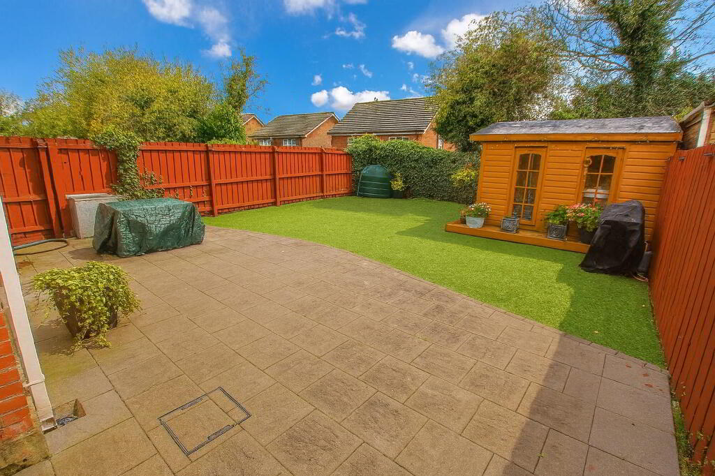 Enclosed rear garden in artificial grass. Paved patio area. Summer house (11’10’’ x 9’10’’ internal measurement) with power sockets. Oil tank. Heating boiler. Water tap.