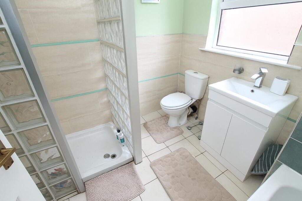 Feature glass shower enclosure with electric shower. Vanity sink unit. W.C. Part tiled walls. Heated towel rail. Recessed lighting. Tiled flooring.