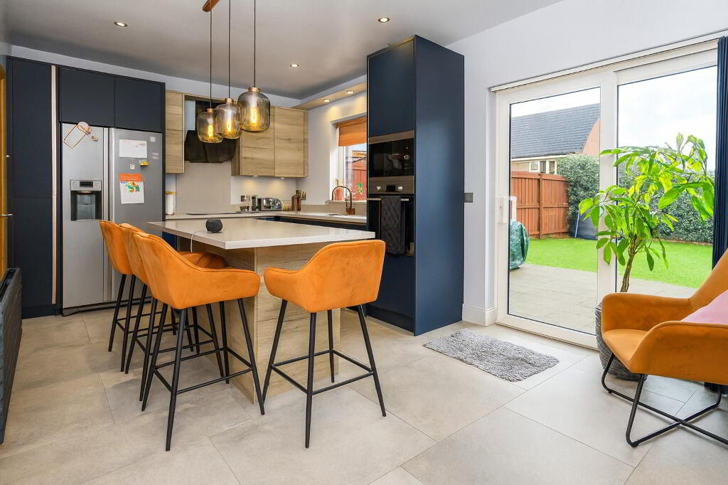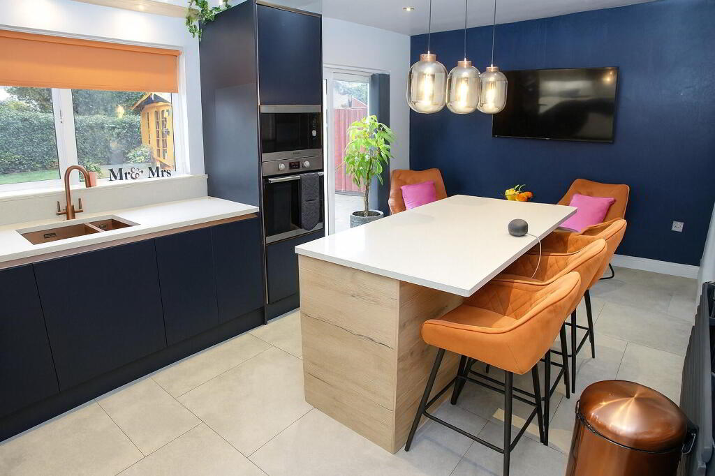 Modern range of high and low level units incorporating pelmet with spot lighting. Centre island with wine cooler and breakfast bar. Quartz worktops. Electric hob. Extractor canopy. Eye level electric oven and microwave. 1½ bowl stainless steel sink unit with copper finish. Plumbed for washing machine and American style fridge/freezer. Recessed lighting. Radiator. Patio doors to rear garden.