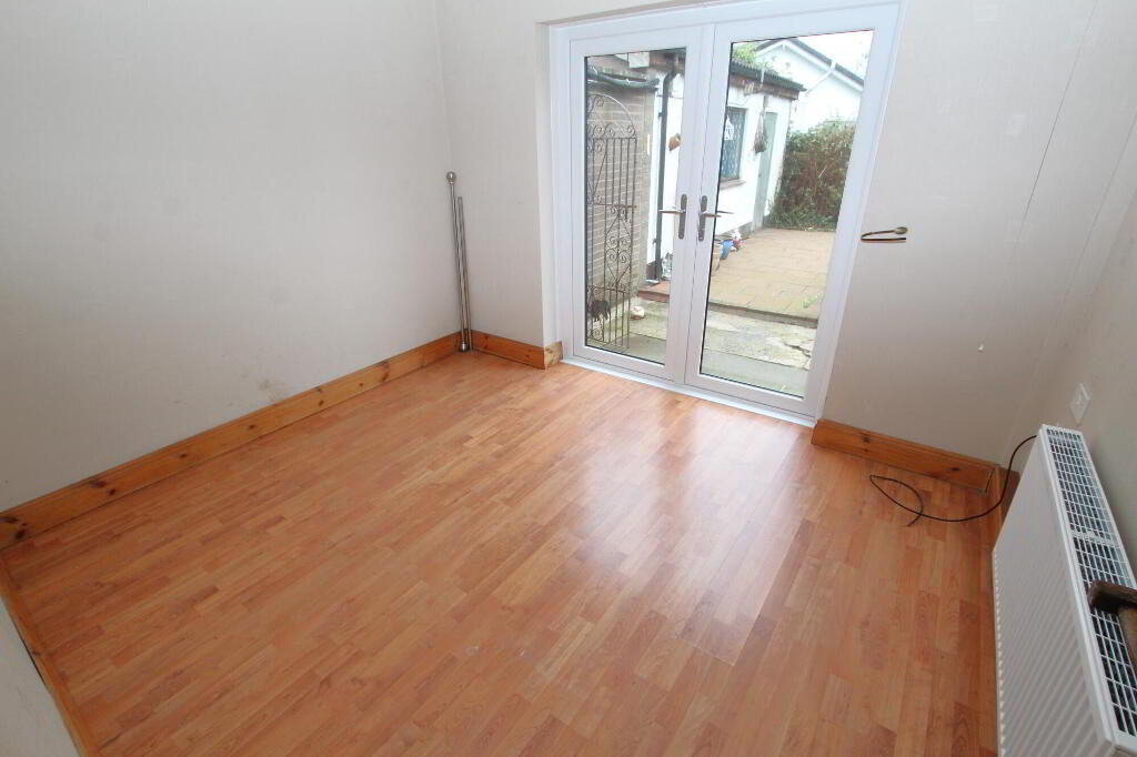 Laminate wood flooring. PVC patio doors to rear garden. Ceiling rose. Radiator.