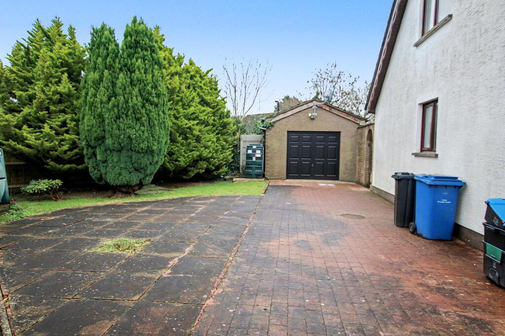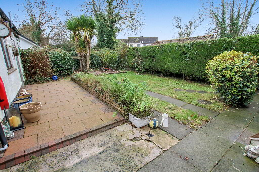 Private enclosed rear in lawn with paved path and raised patio area. Oil tank. Water tap.