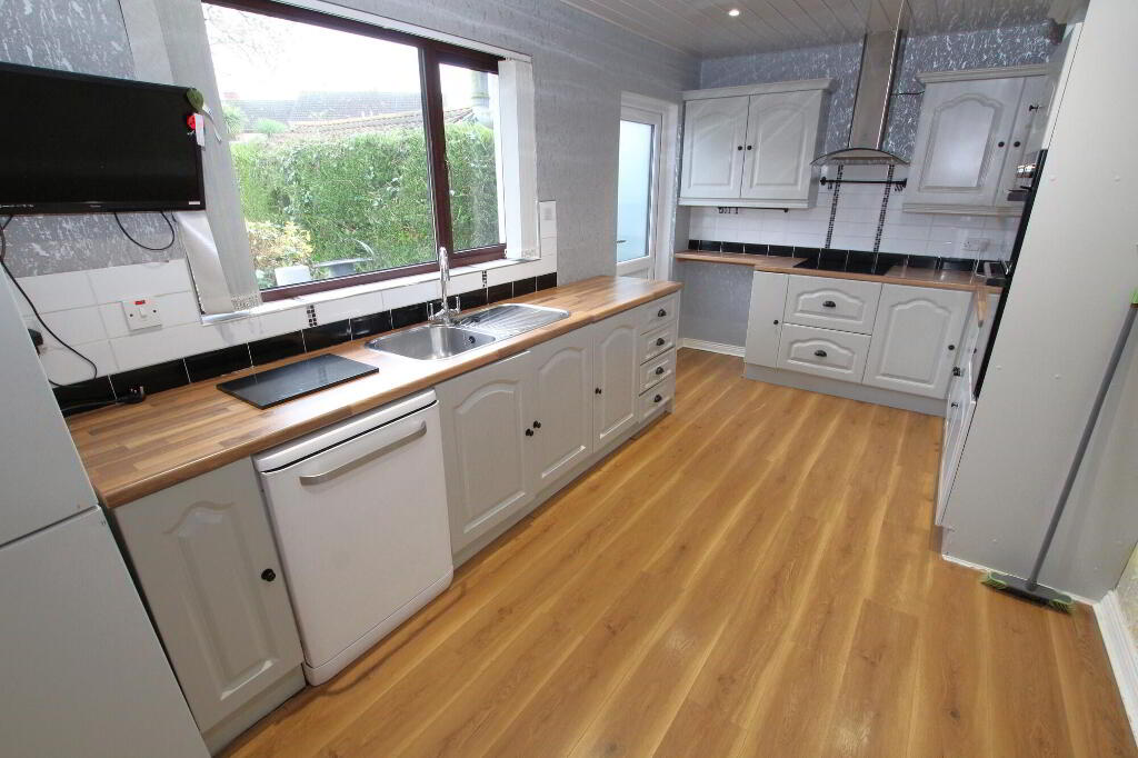 Range of high and low level units. Double eye level electric oven. “Logik” electric touch screen ceramic hob. Extractor canopy with light and fan. Stainless steel sink unit with mixer taps. Plumbed for dishwasher. Part tiled walls. PVC tongue and groove ceiling with recessed lighting. PVC external door. Radiator.