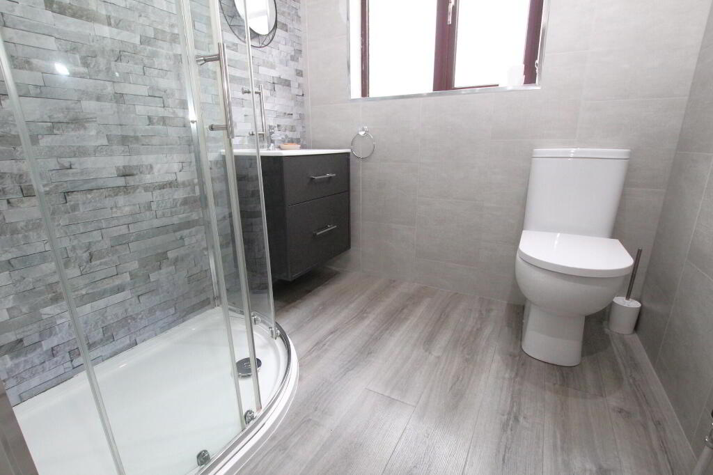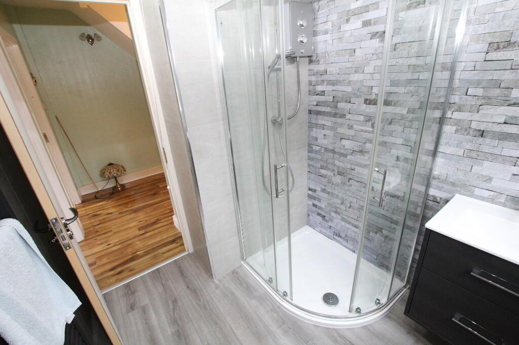 Shower cubicle with duel shower fitting. Vanity sink unit. W.C. Tile and slate effect panel walls. PVC tongue and groove ceiling with recessed lighting. Heated towel rail.