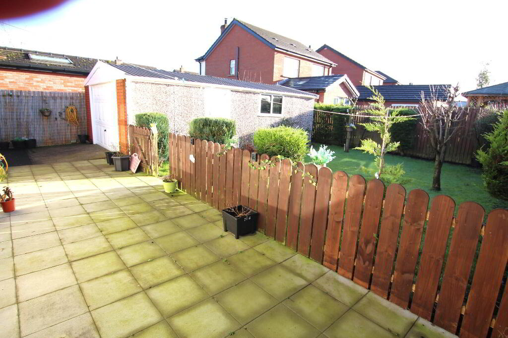 Enclosed rear garden also in lawns with shrubs. Retractable awning. Patio area. Water tap. Wood panel boundary fence with double entrance gates to driveway. Heating boiler. Oil tank.