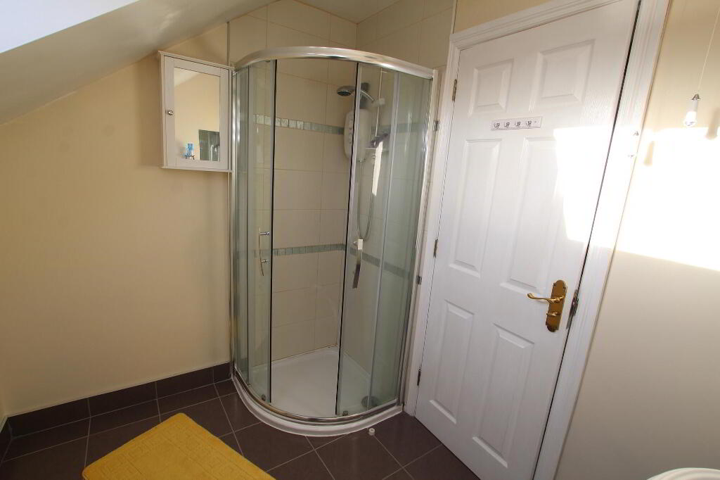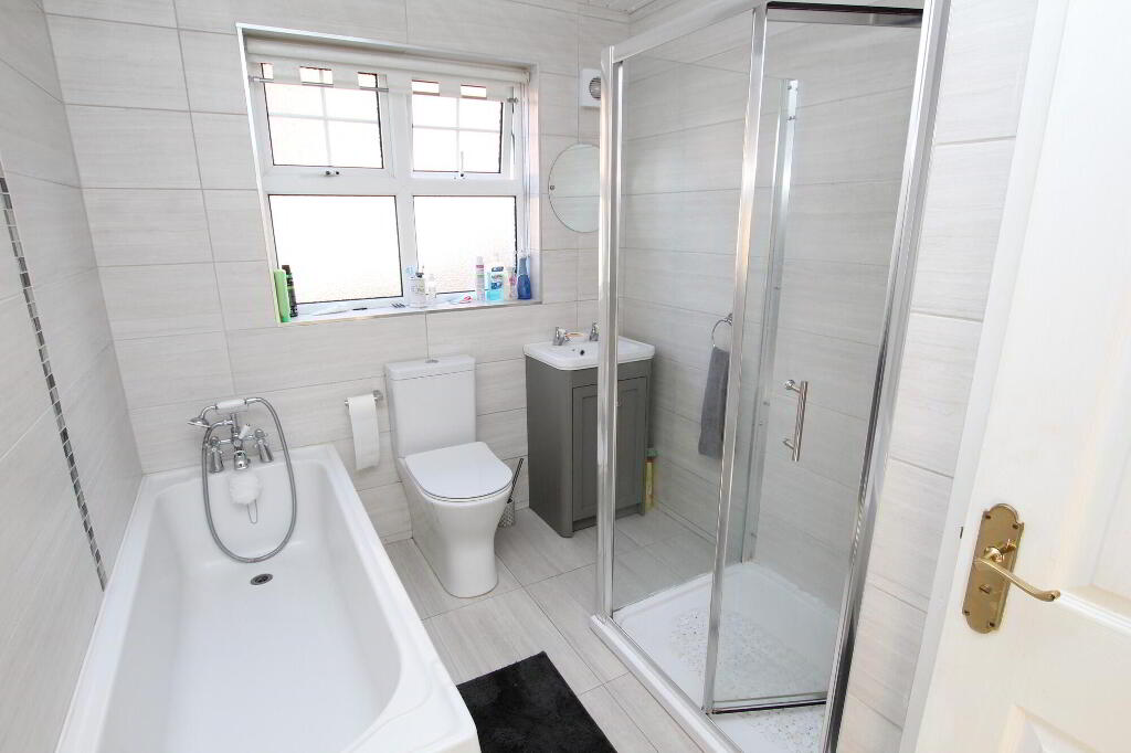 Panel bath with telephone shower fitting. Double shower cubicle. Vanity unit with wash hand basin. W.C. Tiled walls and floor. PVC ceiling with recessed lighting. Radiator.