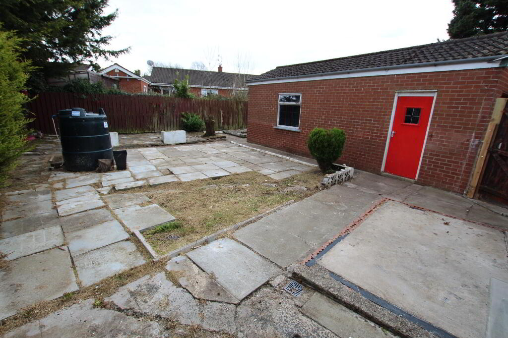 Garden area with shrubs to front. Rear flagged patio area.
