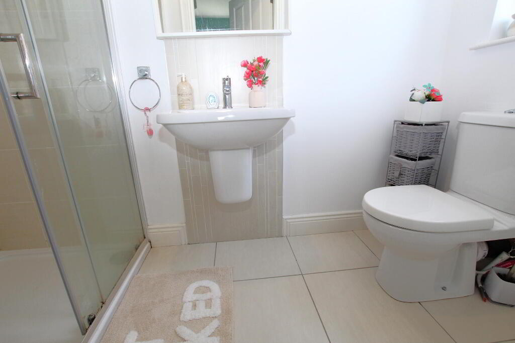 Tiled shower cubicle with dual shower fitting and double shower tray. Wall mounted sink unit. W.C. Part tiled walls. Ceramic tiled flooring. Radiator.