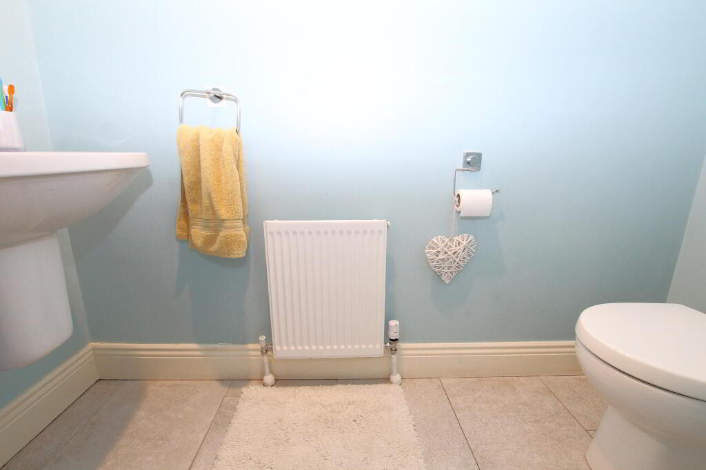 W.C. Wall mounted sink unit with tiled splash back. Ceramic tiled flooring. Radiator.