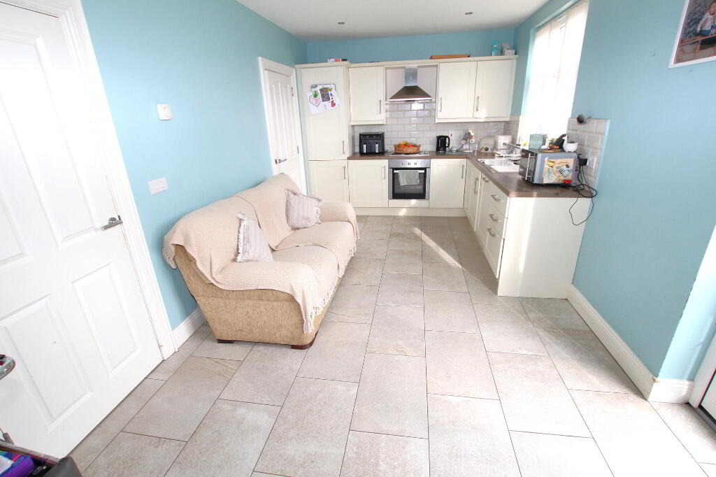 Range of high and low level units with integrated appliances including: fridge, freezer and dishwasher. Electric hob and under oven. 1½ bowl stainless steel sink unit with mixer taps. Extractor canopy with light and fan. Ceramic tiled flooring. Recessed lighting. Radiator. French doors to rear garden.