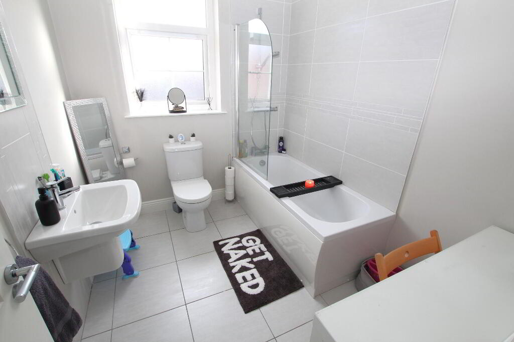 White suite includes: Panel bath with shower over. Wall mounted sink unit. W.C. Part tiled walls. Ceramic tiled flooring. Radiator.