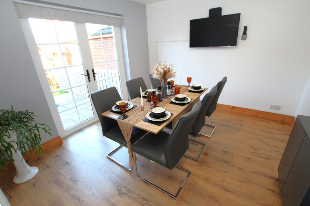 Range of high and low level units. 1½ bowl stainless steel sink unit with mixer taps. Electric hob and under oven. Stainless steel extractor canopy with light and fan. Plumbed for dishwasher. Radiator. PVC external door.